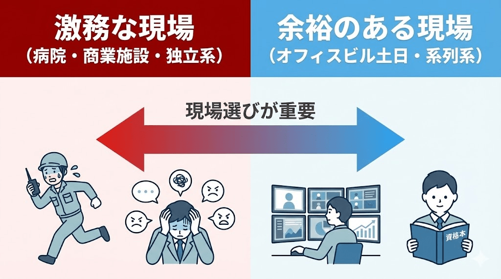 ここまでお話ししたように、ビルメンの仕事は現場次第で大きく変わります。しかし、それ以上に「どんな会社に入るか」で余裕の度合いが決定的に変わります。