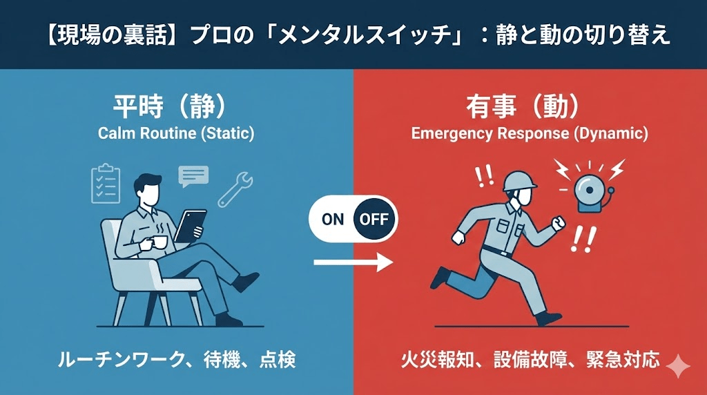 何事もない時間は穏やかに過ごし、異常を察知した瞬間だけ集中力を最大化させる。このメリハリこそが、長く働き続けるための極意なのです。