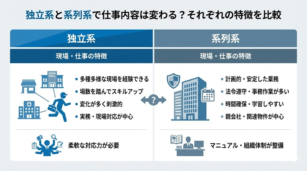 転職先を検討する上で、「独立系」と「系列系」のどちらを選ぶかは重要な分岐点となります。同じ仕事内容でも、会社によって進め方や環境は大きく異なるのが実態です。