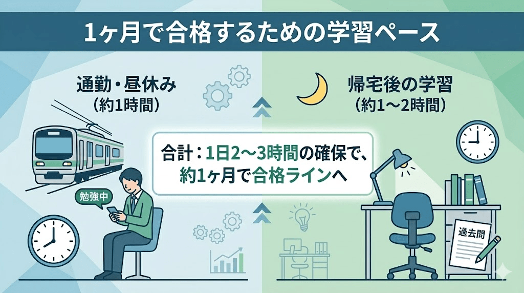 私が実際に合格した際のペースですが、「1日2〜3時間」の勉強時間をしっかり確保できれば、約1ヶ月で合格レベルに到達できます。