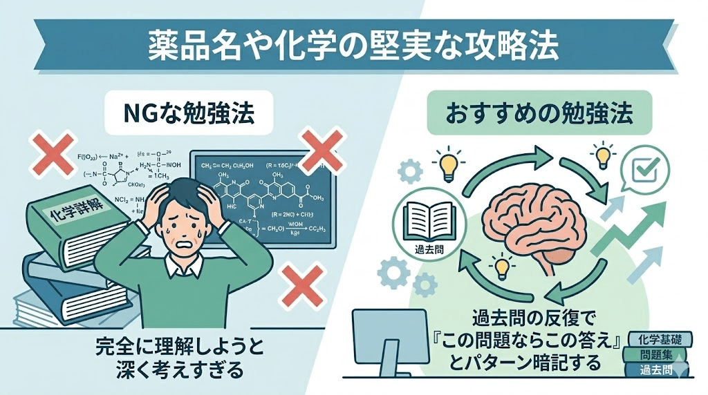 - 難しい薬品名や化学の知識は「反復によるパターン暗記」で乗り切れる