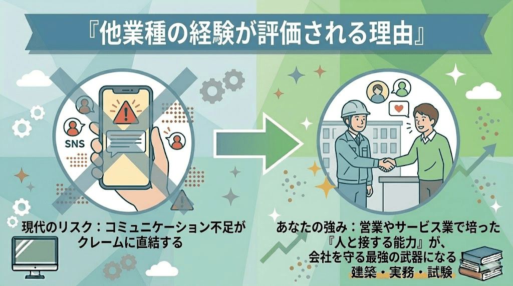 あなたが前職の営業や接客で培ってきた対人能力は、会社にとって非常に価値の高いリスク管理スキルなのです。