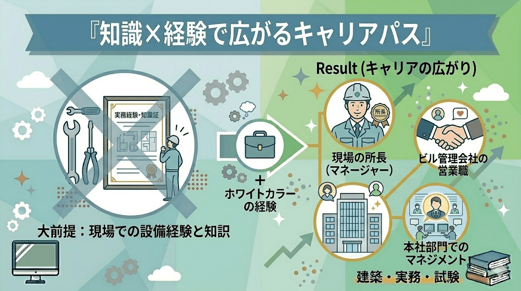 しかし、現場でしっかりと設備の基礎を身につけた後、その知識と『前職のホワイトカラーの能力』を掛け合わせることで、キャリアの選択肢は大きく広がります。