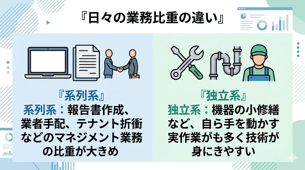 系列系の現場では、自ら工具を持って大がかりな修理をするよりも、専門業者を手配して指示を出したり、オーナーへ修繕の提案をしたりする『マネジメント業務』の比重が大きくなる傾向があります。