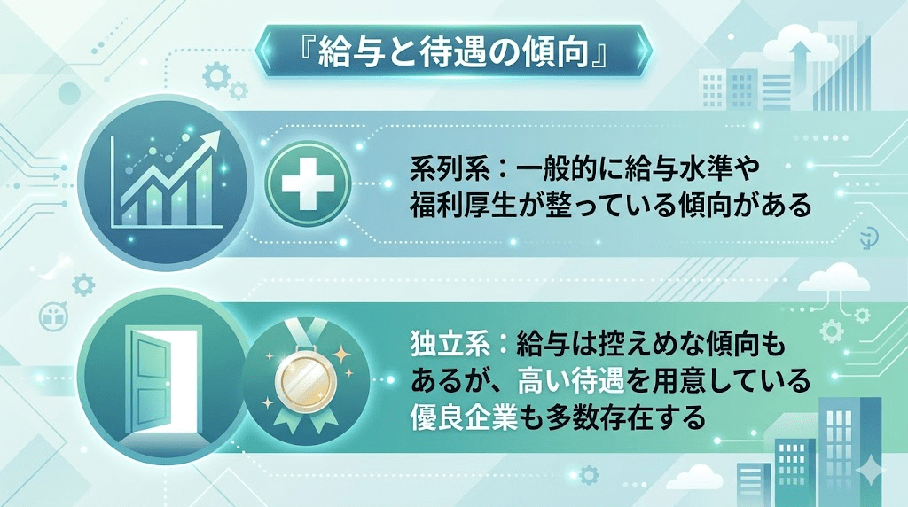 ただ一般的には系列系の方が給料面や福利厚生で有利と言われておりますし、私自身も10年以上業界にいますがそう感じます。